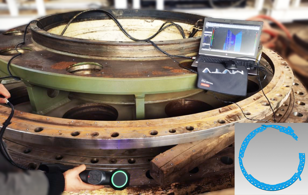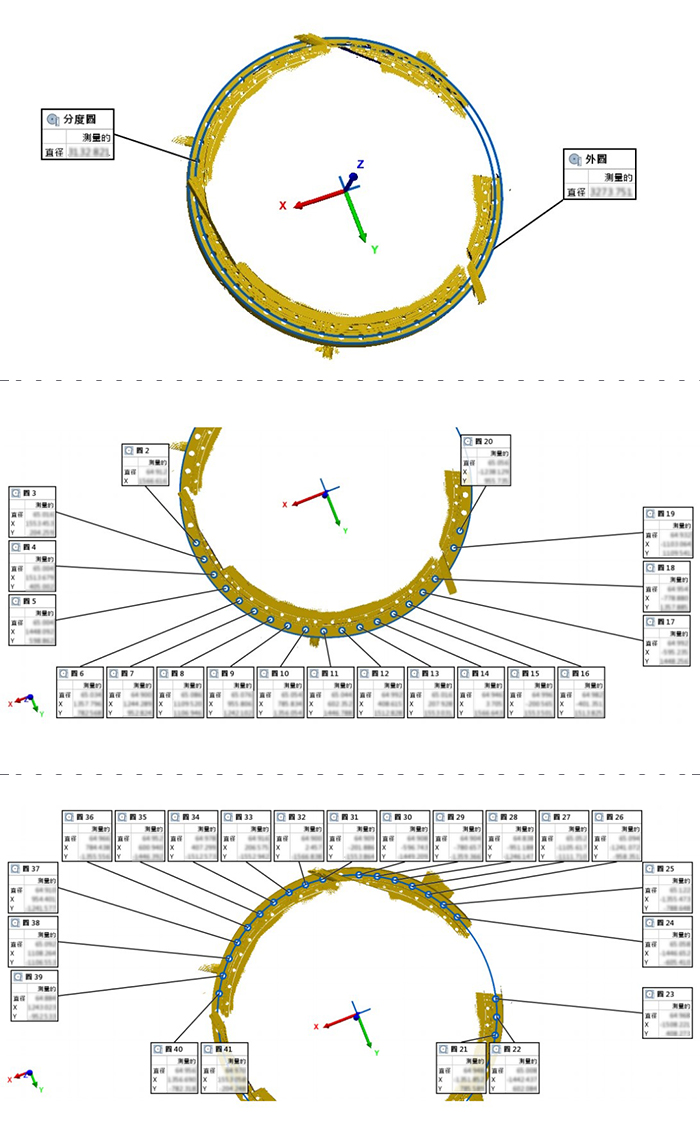 客戶為西南某制造企業(yè),有一圓柱形工件(直徑3m),因已使用一定年限而有所磨損,客戶需要采集該工件數(shù)據(jù),獲取外徑、所有孔位尺寸及小孔分度圓等關(guān)鍵尺寸,判斷偏差是否在容差范圍內(nèi),同時用于安裝在該工件上的配套工件的逆向設(shè)計。