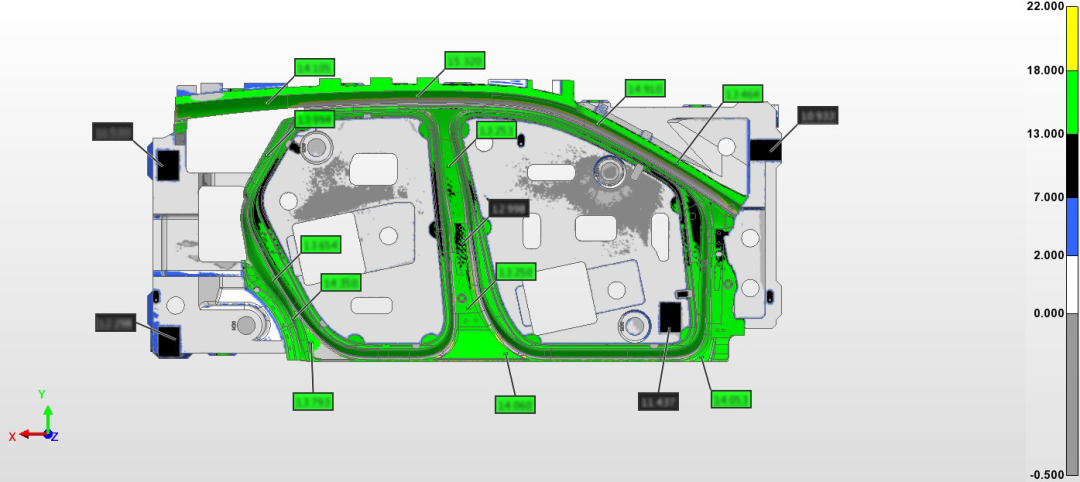 ▲將三維檢測數據與原數模進行比對,得到各位置的加工余量。汽車側門模具加工余量色彩差圖(檢測報告部分示意)